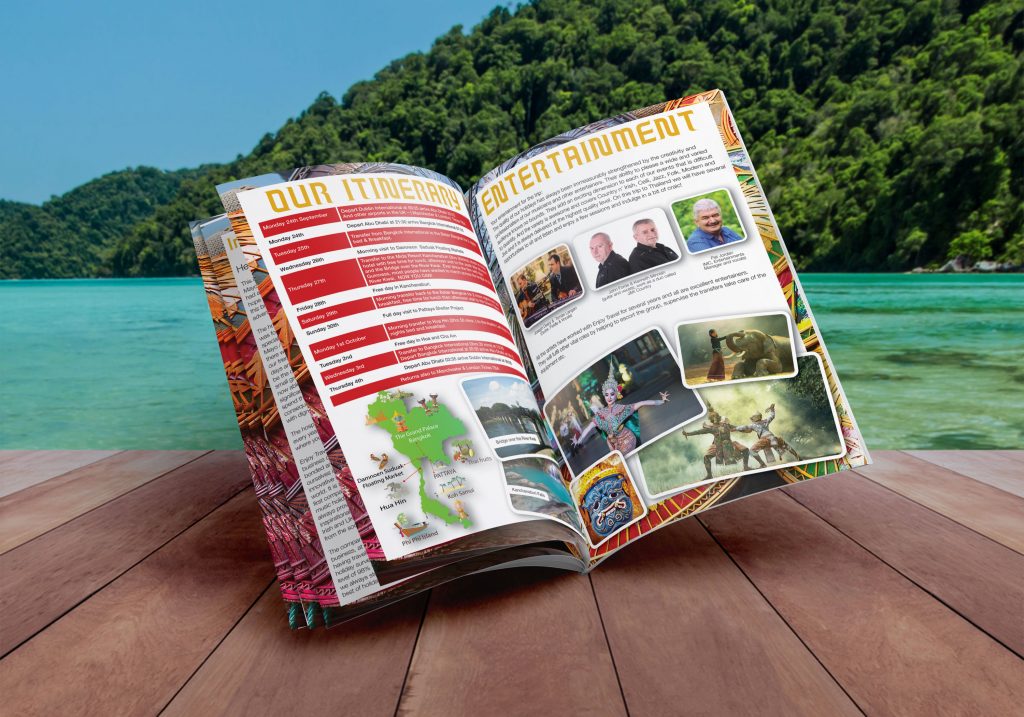 This was a 16 page brochure for promoting trip to Thailand. Visuals were used to highlight both the varied elements of the Thai culture and the activities available on the trip.